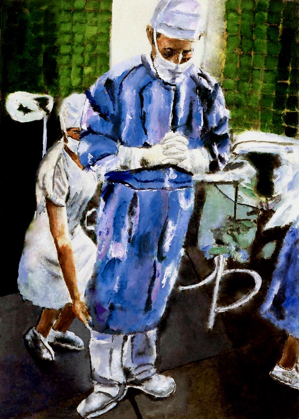 “My favorite painting of Joe’s is Contemplation Before Surgery,” says Koop. “I know the surgeon has just scrubbed his hands and arms to the elbow and while doing so was subconsciously or consciously going over the details of the operation. His body and mind are now as prepared as they will ever be to engage the surgical challenge ahead. He is also . . . communicating at all times with the other team players, for their contributions are significant if the surgery is to be successful.”